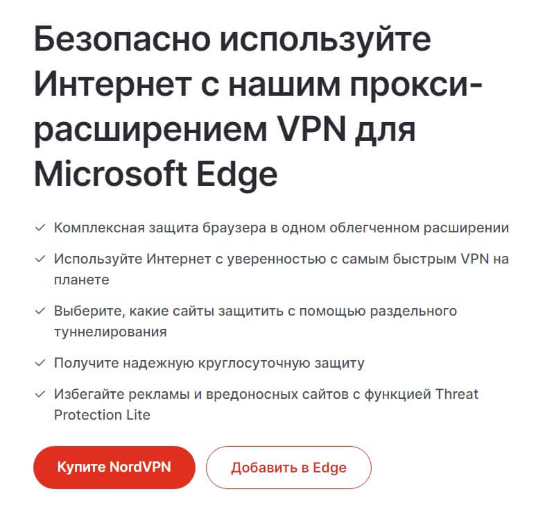 Установка расширения NordVPN в браузер Edge возможна двумя путями: через магазин расширений или с официального сайта nordvpn.com. Если вы решили воспользоваться сайтом, рекомендуем вам включить сторонний VPN, так как сайт заблокирован на территории России.